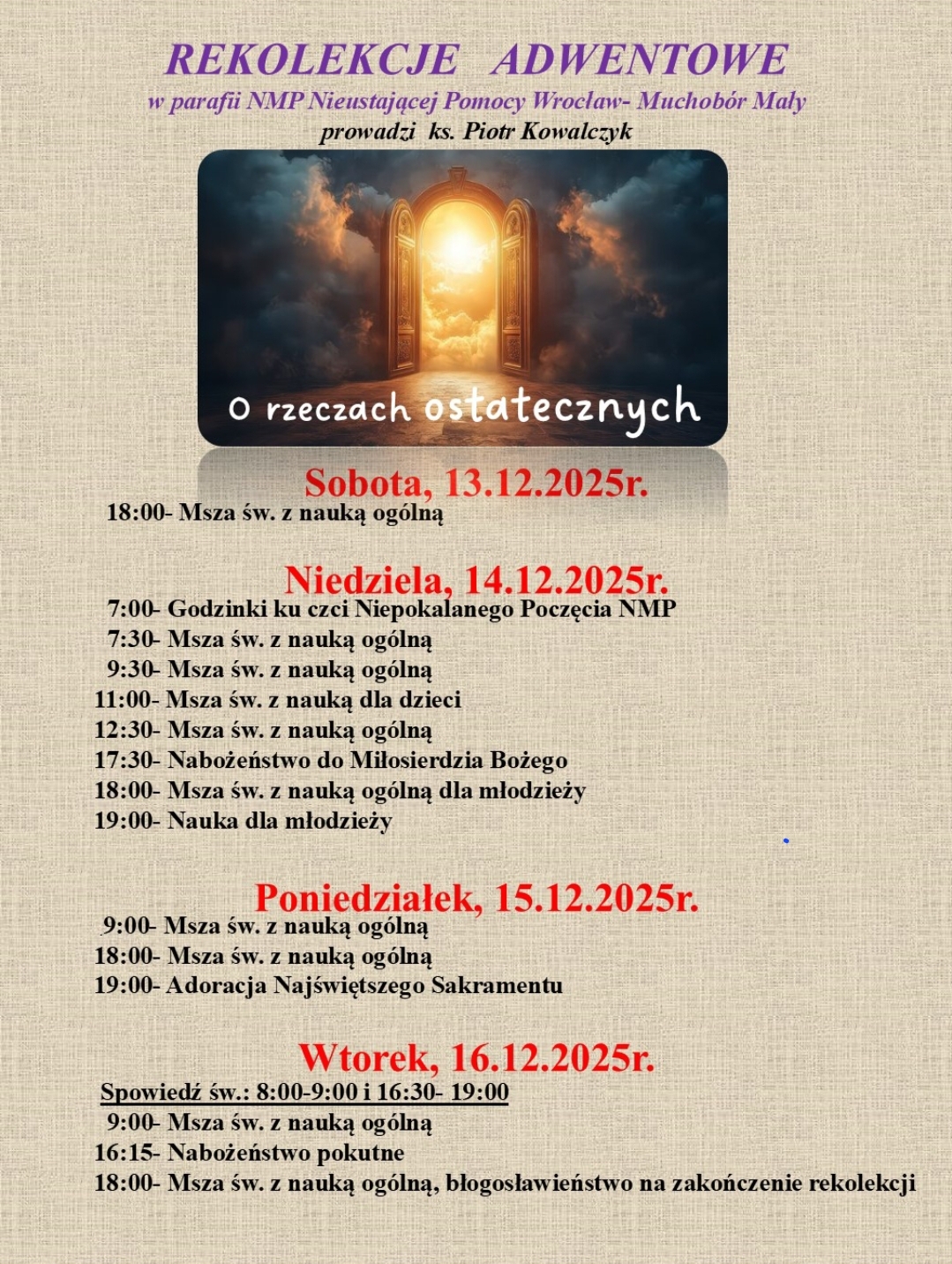 Zapraszamy na Rekolekcje Adwentowe, które tozpoczną się 13 grudnia 2025r. Mszą św. o godz. 18:00.